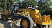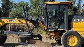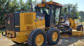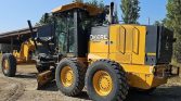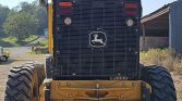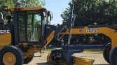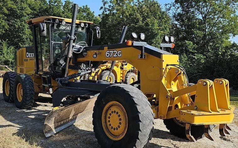 The 2010 John Deere 672G motor grader has 9,153 hours on the meter. It is powered by a 6-cylinder John Deere 6090HDW01 diesel engine with a displacement of 9.0L and a Powershift transmission with 8 forward and 8 reverse gears. The chassis features all-wheel drive and a differential lock.