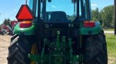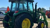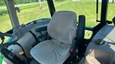 This tractor features a 540 RPM PTO, a three-point hitch with top link, and a seven-pin electrical outlet. It has hydraulic remote sets with two in the front and one in the rear. A John Deere 520M loader is attached and is operated using a joystick control. The tires are sized 11L-15 in the front and 16.9-28 in the rear.