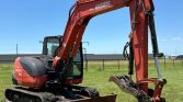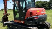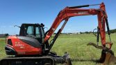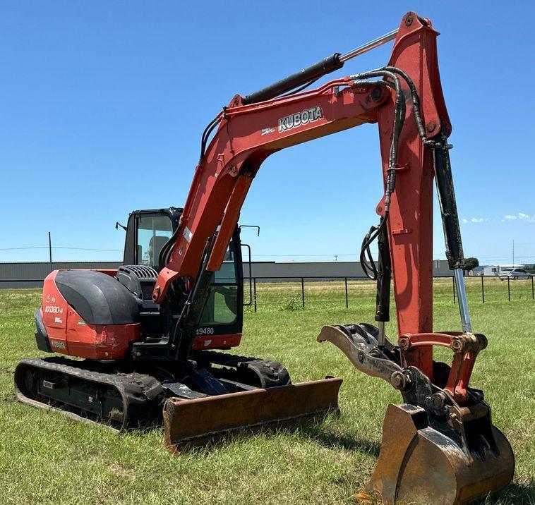 The 2021 Kubota KX080-4 mini excavator has 1,569 hours on the meter and is powered by a robust four-cylinder Kubota diesel engine with a 3.3-liter displacement. Featuring hydrostatic two-speed travel and an enclosed cab equipped with air conditioning, heat, and a pattern changer, it offers excellent operator comfort and control. This machine includes auxiliary hydraulics, an 83-inch backfill blade, a 7-foot stick with boom swing, and a mechanical quick coupler for easy attachment changes. The 29-inch bucket with five teeth and a hydraulic thumb enhances digging precision and versatility. Mounted on 16-inch steel tracks, it delivers strong traction and stability on a variety of terrains, making it ideal for demanding excavation projects.